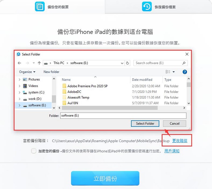 第4步:瀏覽並選擇您想要更改的iPhone備份位置,然後您就可以開始備份了。